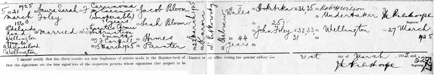 Laura Foley death notice DEATHS.,Evening Post, Volume CIX, Issue 67, 21 March 1925 http://paperspast.natlib.govt.nz/newspapers/EP19250321.2.4