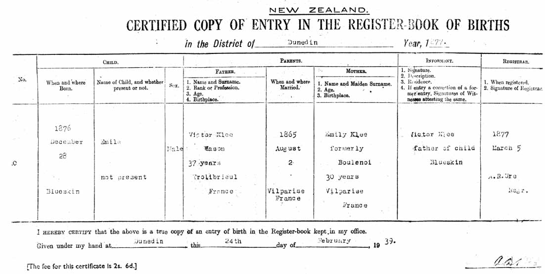 Emile Klee was Victor and Emelie’s first son born in New Zealand at Waitati on 28 December 1876. Unlike his brothers Louis, Victor and George he did not volunteer to serve in the Boer War.